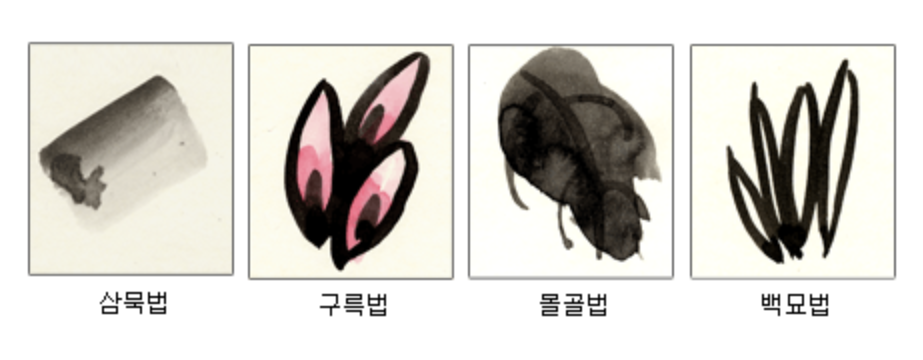 - 먹이나 채색을 붓에 찍어 한 붓으로 그리는 법